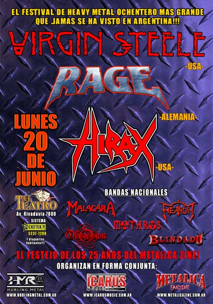 20 de Junio, día de la bandera. Día de celebración de uno de los festivales metaleros de mayor magnitud que vivió la Argentina en los últimos años. Porque se reunían bajo un mismo techo, el de El Teatro de Flores, tres bandas internacionales de extensa y respetada trayectoria: Hirax, Rage y Virgin Steele. Tres bandas de afuera, tres bandas de los legendarios e irrepetibles años ochenta, algo poco usual en estas latitudes que espero se torne una costumbre. El motivo: la celebración de los 25 años del Metalica Zine.