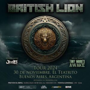 La banda británica British Lion, liderada por el legendario bajista de Iron Maiden, Steve Harris, ha confirmado una serie de nuevas fechas para su esperada gira latinoamericana en noviembre y diciembre. Este tour incluirá por primera vez presentaciones en México y Colombia, además de su regreso triunfal a Chile, Argentina y Brasil. Como parte de esta gira, Tony Moore y su proyecto Awake serán los invitados especiales en todas las fechas. En Argentina, el show tendrá lugar el 30 de noviembre en El Teatrito, donde la banda contará con un invitado local de lujo: Jerikó, legendaria agrupación del heavy metal argentino, que conmemora sus 30 años de trayectoria.