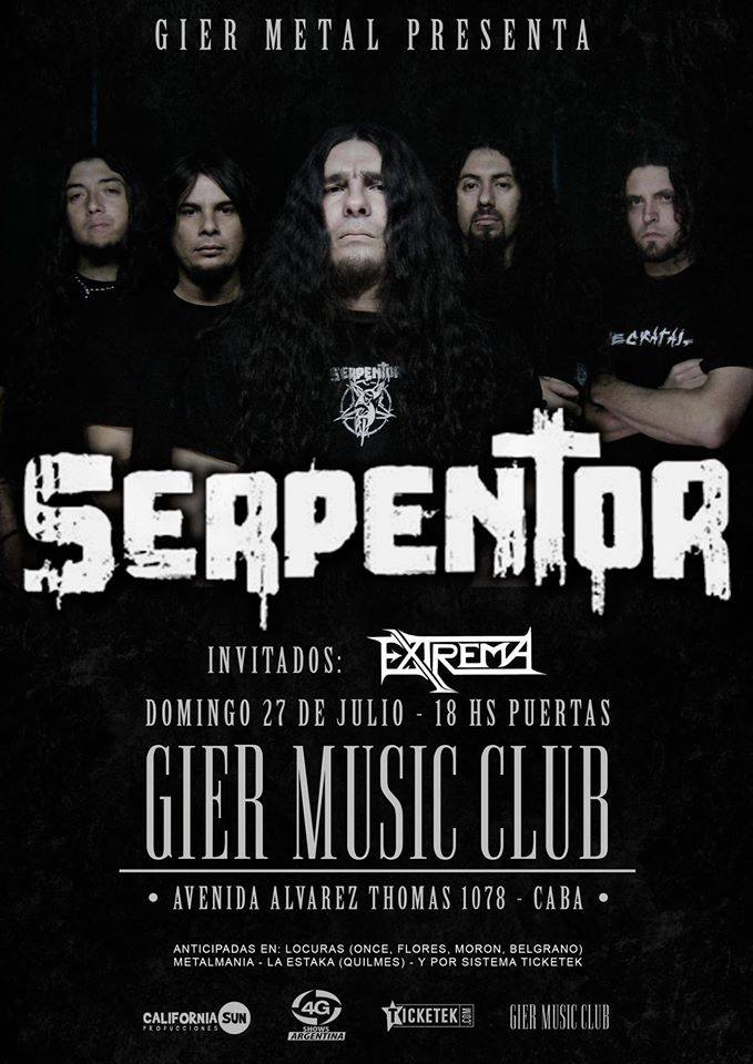 Ya sobre el final del fin de semana quedaba una cita obligada más, la de Serpentor en Gier Club. Arribé al bar de Chacarita cuando Againts se estaba por desenvolver en el escenario. Con gran potencia y velocidad thrash metal más pequeñas influencias del groove de los noventa, la banda conformada por Federico Gervan (bajo), Gustavo Radrizzani (batería), Iván (guitarra/voz) y Sebastián Radrizzani (guitarra/voz) irrumpió en el escenario derramando adrenalina. El intercalado de voces y el juego de tiempos mostró un sonido nuevo y atrevido que rompe con el esquema de las nuevas bandas de metal. «Kick in the Face» y «Soy libertad» son claros ejemplos. Sin embargo Extrema es una banda clásica de thrash/death metaly no por eso ineficaz. Lamentablemente no contó con el mejor sonido durante su repertorio pero si con una numerosa audiencia.