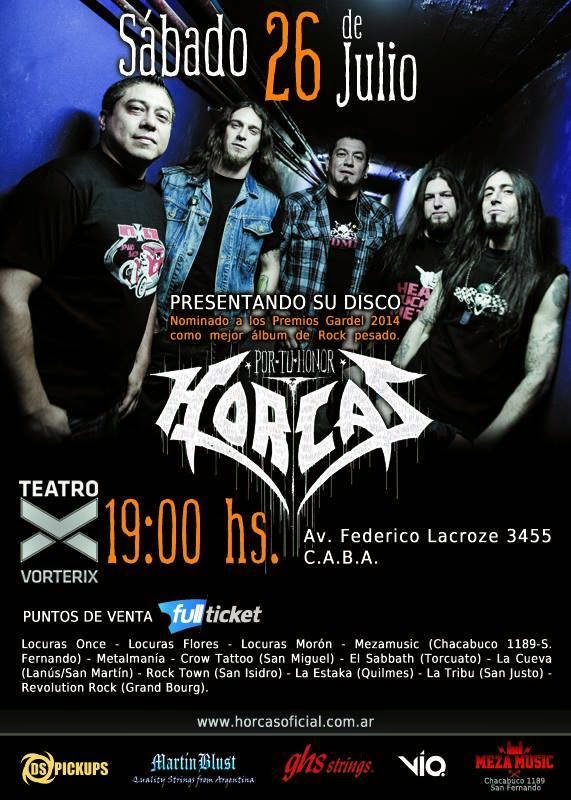 Horcas se hizo presente en el Teatro Vorterix con el fin de presentar su último disco “Por tu Honor”. Antes que la banda saliera a escena, el público hacía notar, con banderas y cantos, lo que sería una gran fiesta que quedaría grabada por las múltiples cámaras que estaban distribuidas en un teatro repleto de seguidores de todas las edades. Minutos pasadas las 21:00hs se escuchó la intro que dio inicio el concierto, se abrió el telón y los primeros dos temas del disco “En la jaula” y “Cazador” sonaron, seguidos por “Ahora o nunca”, con un sonido avasallante y un público eufórico que no paraba de gritar y cantar cada una de las canciones. Tras los primeros tres temas vendrían dos del CD homónimo de la banda grabado en 2002 “Reacción” y “Mano Dura”. Entre tema y tema, Walter Meza no dejaba de agradecer tanto a la gente, nombrando, como es de costumbre en él, los barrios y provincias de las cuales vienen los fanáticos, como así también a músicos amigos que no quisieron perderse el show entre los que se encontraban miembros de Viticus, Kapanga, Tren Loco y Malón.