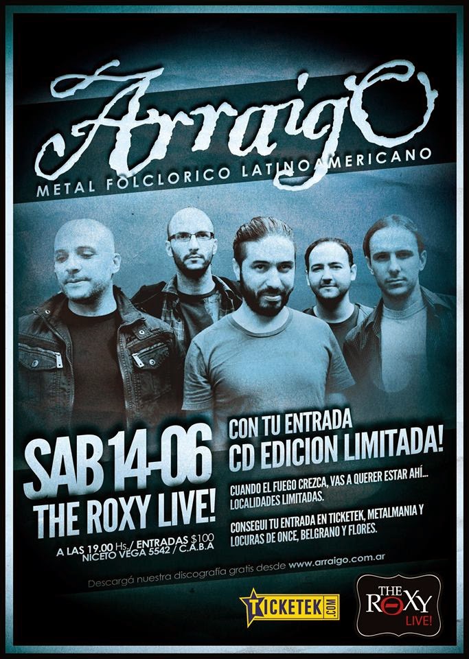 Arraigo, la banda más representativa del folk metal en clave latinoamericana, conoció este 14 de junio que pasó uno de los hitos más importantes de su carrera, al tocar por primera vez en el Roxy Live del barrio de Palermo, con una amplia convocatoria, convirtiéndose así en el show más grande de su historia (que seguramente será superado, tienen mucho futuro por delante).
