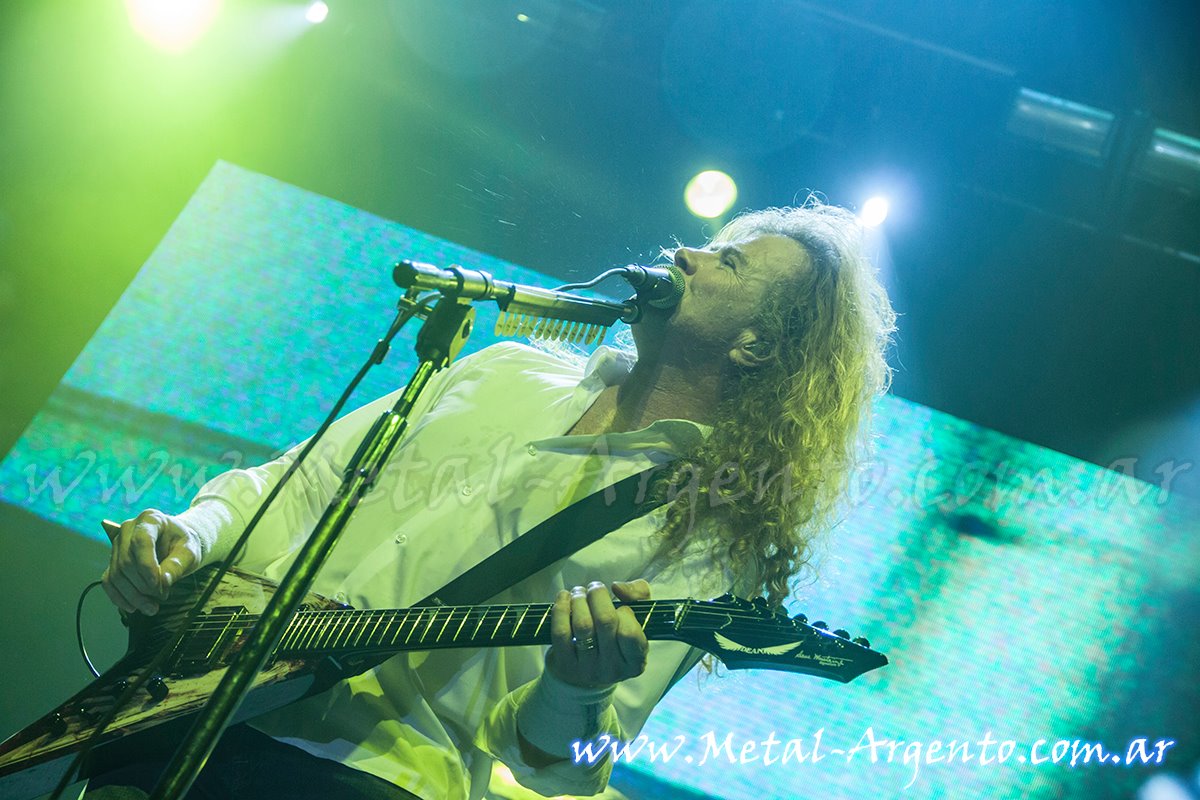Ahora el momento más esperado de la noche por todos los presentes que ya no soportaban el calor, por el cual debieron sacar a muchas personas sofocadas antes del show. Las luces se apagaron y se prendieron las pantallas sobre el escenario saliendo de a poco los músicos hasta que el hombre mas aclamado de camisa blanca con su melena colorada pisó el escenario. Dave Mustaine sin decir ni una palabra arranca “Hangar 18” y los fuertes golpes de Shawn Drover en batería acompañado de esos magníficos solos de Mustaine. Con los puños en alto, el pogo y el mosh que no cesaba siendo recién solo el inicio sumado a la potencia de los golpes de los parches de Drover siguieran avasallando en “Reckoning day”. Pasando a “Wake up dead” del disco Peace Sells… But Who’s Buying? (1986) donde se notaba claramente el rasgado de las cuerdas de la guitarra de Chris Broderick y el bajo de David Ellefson junto a la voz aguda, áspera y particular del colorado Mustaine. Era difícil de creer lo que se estaba viviendo en el show de Megadeth siendo uno de los show más esperado desde el año pasado, la euforia y éxtasis de la gente era indescriptible algo que solo la ellos podían lograr en el público argentino. Siguiendo con “In my darkest hour”, “Sweating bullets”, “She Wolf” decorado con una enormes pantallas a los costados y arriba de Drover con imágenes y fragmentos de películas que daban pie a los temas mezclado con una gran variación de juegos de luces que generaban un clima de puro thrash metal.