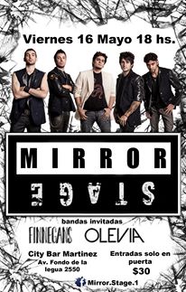 Mirror Stage es una muy joven banda de rock alternativo con tintes pesados. Finnegans y Olevia fueron invitados a la fecha debut en City Bar Martínez. A pesar de que la puerta estaba anunciada a las 19 horas recién sesenta minutos después se abrieron y unos treinta minutos más pasaron para que la primera banda salga a escena. Se trató de Finnegans, banda conformada por Nicole Mugneco en voz principal, Nicolás Torregiani en el bajo, Patricio Thiessen detrás de los parches, Hernán Perez Figuls y Matías Sorrentino como guitarristas. Activo desde el 2008 y con un disco bajo el brazo, titulado «Los Fuertes», Finnegans irrumpió en el escenario. «Zombies» y «Los fuertes» fueron temas fuertes con solos intensos sumados al gran caudal vocal de Niki, por momentos con desgarros similares a los de Lula Bertoldi (Eruca Sativa). Lo más intenso de su repertorio llegó con su versión de «Where did you sleep last night» de Nirvana, quebrando la voz con la misma intensidad que Kurt Cobain, logra erizar la piel del que escribe. En segundo lugar salió Olevia, un joven power trio conformado por Agustín Agüero, Manuel Álvarez y Cristián Failo. Presentando temas de su primer disco «Humanamente Natural» podemos notar fuertes influencias de Carajo hasta llegar a Red Hot Chili Peppers. Cortes precisos, tres voces intercaladas por coros y por momentos con control total despertaron un fuerte entusiasmo en el público, algo notorio cuando decidieron hacer «Give me the power» del grupo mexicano Molotov y «Frente a mi jardín» de su propia autoría.