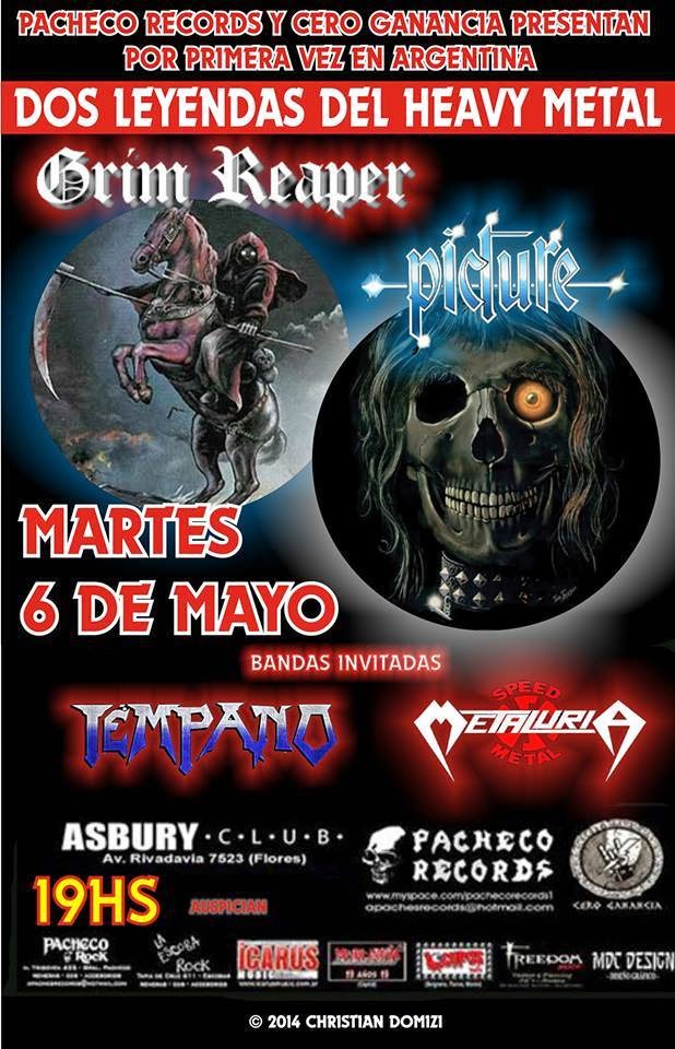Grim Reaper fue una de las grandes bandas de la New Wave of British Heavy Metal que, a pesar de no haber logrado el gran éxito de bandas como Iron Maiden o Saxon, editaron tres álbumes que se ubican entre los más destacables del género. Tras separarse en 1988, el cantante Steve Grimmett refundó la banda en 2006 con los miembros de su grupo solista como “Steve Grimmet’s Grim Reaper”. En esta gira sudamericana que los trajo a la Argentina para presentarse el martes 6 de mayo en el Asbury (donde mejoró bastante el sonido desde la remodelación), los acompaña Picture, uno de los primeros actos de heavy metal surgido en los Países Bajos, para completar así una imperdible fecha del heavy metal de culto. A las 20:15 la jornada arrancó de la mano de Metaluria, a pura energía como no podía ser de otra forma con “Speed metal”, seguido de “Nuestro camino”, de su primer demo Speed Metal, dos canciones que sintetizan su sonido vieja escuela de los 80 a base de velocidad, riffs clásicos y voces agudas, junto a la consigna de cuero, tachas y heavy metal. La banda oriunda de San Fernando está conformada por Manuel Pérez en las voces, Federico Vega y Darío García en guitarras, Emiliano Montoya en bajo y Gerónimo Grot en batería, y tuvo un gran recibimiento por el público, el cual a diferencia de otras ocasiones, ingresó en gran parte a ver a todas las bandas. Presentaron otras canciones de su último EP como “Posesión infernal” o “Fuerzas en la noche”, mediadas por viejas canciones de su demo como “Kimera de un oficial”, con una de sus mejores letras en repudio a la policía y dejando un poco de lado la seriedad, “Panza metalera”, su clásico que funcionó de cierre.