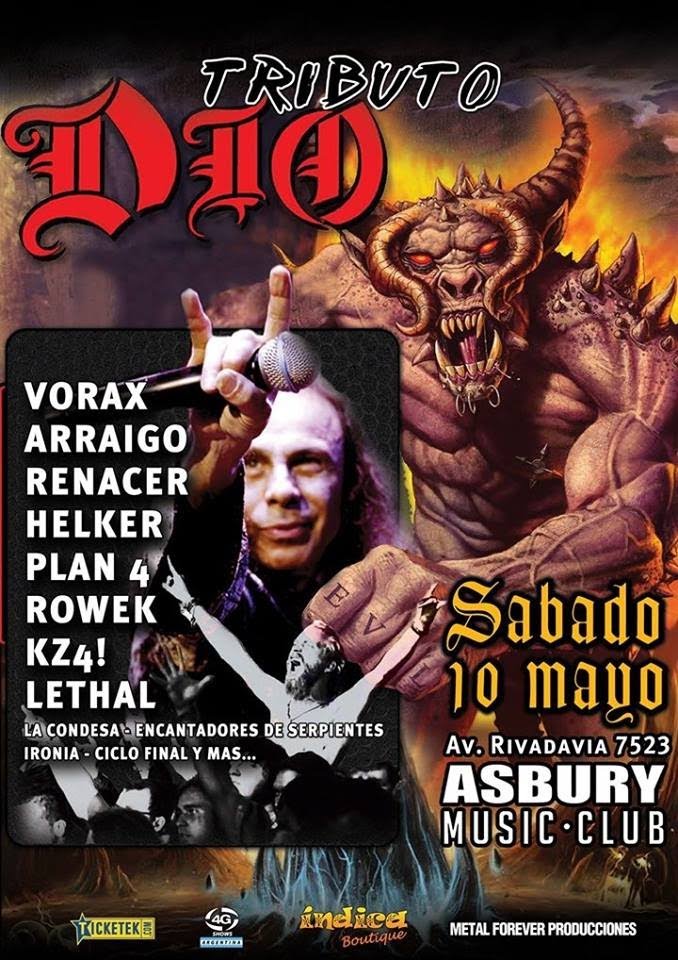 Ronnie James Dio es uno de los mejores cantantes de heavy metal que dio la escena mundial y seis días antes de que se cumplan cuatro años de su fallecimiento, bandas como Rowek, Lethal, Helker, Plan 4, Renacer entre otras, hicieron un festival en homenaje al gran cantante italoamericano. Justo a las 23hs subió Arraigo al escenario, la banda de folk metal salió a escena con «Mistery». Arraigo está compuesta por: Pablo Trangone en voz, Federico Bertoli en guitarra, charango y coros, Javier Espeche en bajo, Leandro Ramogida en guitarra y Federico Prieto en batería y bombo legüero. Luego la banda interpretó en versión en español «Rainbow in the Dark» y cerró su pequeño set con un tema propio «Carnaval de Soledades» que abre su primer larga duración «Fronteras y horizontes». A los pocos minutos Shaffo Pastor en bajo, Walter Martínez en batería, Rubén Martínez en guitarra y como invitado Miguel Angel Lops en voz coparon el escenario con Vorax que interpretó: «Holy Diver», «The last line» y «Don’t talk to strangers». Ya pasadas la medianoche subió Renacer, banda que se está preparando para hacer una pequeña gira por España en agosto, tocando en el festival «Leyendas del Rock», compartiendo cartel con bandas como W.A.S.P., Arch Enemy, Hammerfall, Volbeat, Strypper entre otros. Arrancaron su pequeño set con «Kill the king», para seguir con «Long live rock and roll» con Javier Barrozo como invitado y para terminar con un tema propio «Alucinado».
