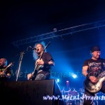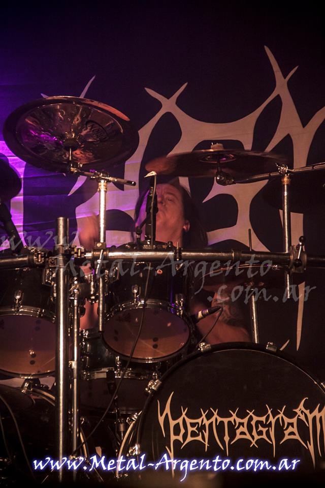 El momento más esperado de la noche llegó a las 22:40 horas con el súbito arranque de Pentagram con “Fatal Prediction”, uno de sus viejos clásicos con que abría su primer demo allá por 1987. A los fundadores Anton Reisenegger (guitarra y voz) y Juan Pablo Uribe (guitarra), se le sumaron desde 2012 Juan Pablo Donoso en la batería en lugar del histórico Eduardo Topelberg, y Juan Francisco Cueto encargado de las cuatro cuerdas para esta gira sudamericana, y desde el principio su set fue una aplanadora, riff tras riff que se suceden alternando entre partes muy veloces con algunos medios tiempos. “The Malefice” sonó a continuación, otra vieja canción veloz que funcionó de título para su primer álbum de estudio finalmente editado el año pasado, donde no solo regrabaron (muy acertadamente) siete canciones de los años ochenta con el sonido actual, sino que nos entregaron diez nuevas composiciones que mantienen la esencia y el nivel de antaño, evidenciado también en el buen recibimiento que tuvieron estas canciones como “La Fiura”, inspirada en la criatura maligna mitológica chilena. Anton luego dedicó “Temple of perdition” a la memoria del ex bajista de la formación original, Alfredo Peña, quien cometió suicidio en 1990.