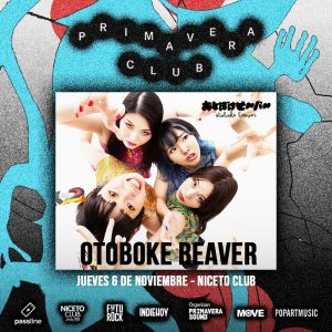 Definido como un cuarteto “knock-out o pound cake”, Otoboke Beaver es un explosivo grupo de punk-rock-garage formado en 2009 en la Universidad de Kioto, Japón. Integrado por Accorinrin (voz y guitarra), Yoyoyoshie (guitarra y coros), Hirochan (bajo y coros) y Kahokiss (batería y coros), la banda deslumbra por su virtuosismo, su energía desbordante y su imponente presencia escénica con influencias que van desde rock japonés, hardcore punk y pop japonés.