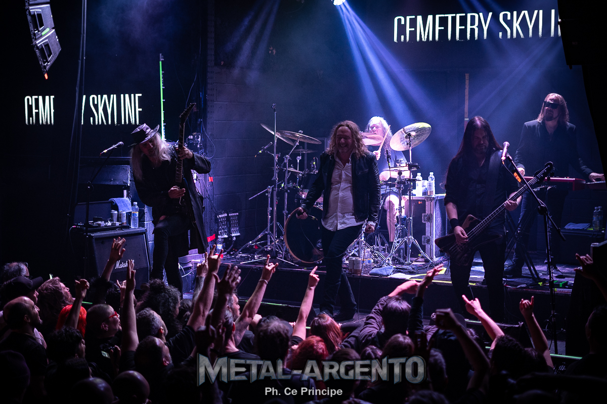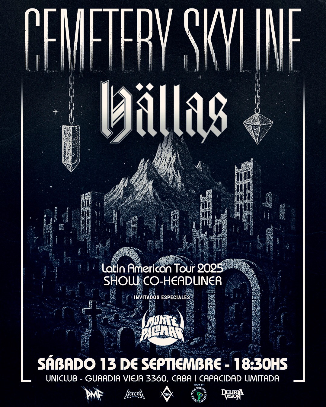 Para aquellos que estamos atentos a los nuevos lanzamientos, las nuevas y a la actualidad de lo que sucede globalmente en esta música que tanto nos gusta, el pasado 13 de septiembre teníamos una cita casi obligatoria. El debut en el país de dos bandas nuevas, con un formidable presente y propuestas tan disímiles como personales, resultaba una bocanada de aire fresco ante una abultada agenda que repite nombres año tras año. Por un lado, Cemetery Skyline, que si bien es una banda nueva formada hace apenas un año, en sus filas encontramos viejos conocidos, a saber: Mikael Stanne (Dark Tranquillity, The Halo Effect, Grand Cadaver) en voz, Markus Vanhala (Insomnium, Omnium Gatherum) en guitarra, Santeri Kallio (Amorphis) en teclados, Victor Brandt (Dimmu Borgir) en bajo y Vesa Ranta (Sentenced) en batería. Por el otro lado, Hällas, quienes rescatan lo mejor del hard rock, progrock, space rock de los 70s, mixturándolo de la mejor manera en algo que han dado a llamar «adventure rock». Como único acto de apertura, la banda santafesina Monte Palomar se encargó de romper el silencio con sus aplastantes riffs made in Sabbath ante un numeroso público que ya iba copando las instalaciones.