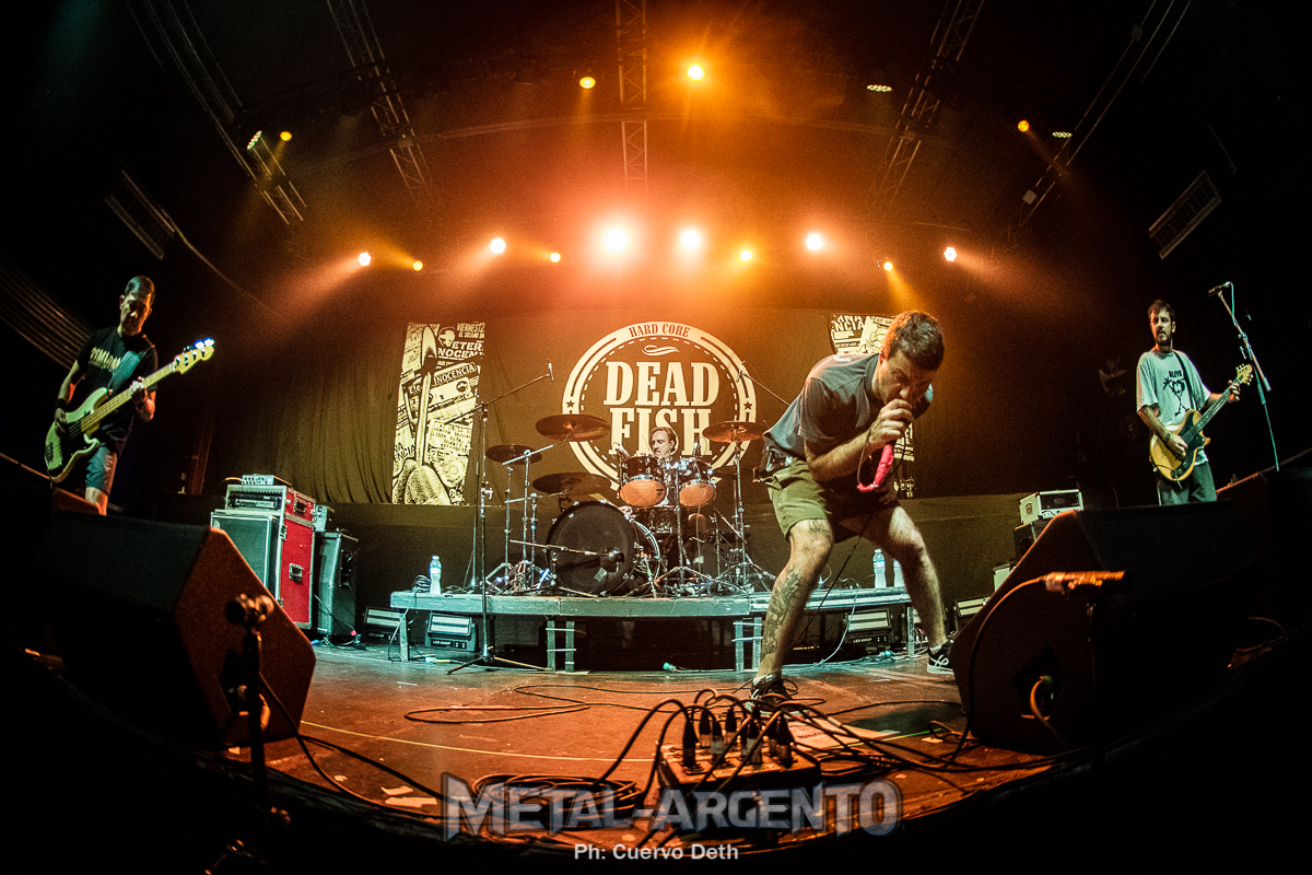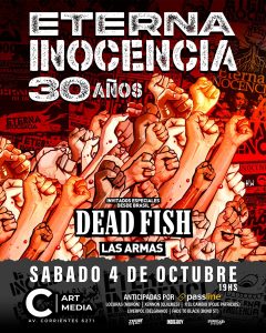 Desde Brasil, Dead Fish es una suerte de Eterna Inocencia. El reflejo se distorsiona con el idioma porque las canciones, la metedologia, la voz, las letras y la potencia son cortadas por la misma tijera. Si bien, todo comenzó a principios de los años 90 con versiones de Bad Brains, Dead Kennedys y Ramones, la banda pasó a componer lo propio para adentrarse en el nombre definitivo: Dead Fish. Con el paso del tiempo, se consagro como uno de los principales grupos de hardcore de Brasil por su discurso político progresista, la banda aborda, en la mayoría de sus letras, la salud y la educación pública, además de denunciar la desigualdad y la violencia en el país. Algo así como Eterna en Argentina. Más cuando entre si, el apoyo es mutuo y las colaboraciones son puentes culturales como la reversión en portuges de «Encuentro Mi Descanso Aquí.« Con una impronta rápida y directa, se despertaron los primeros mosh.