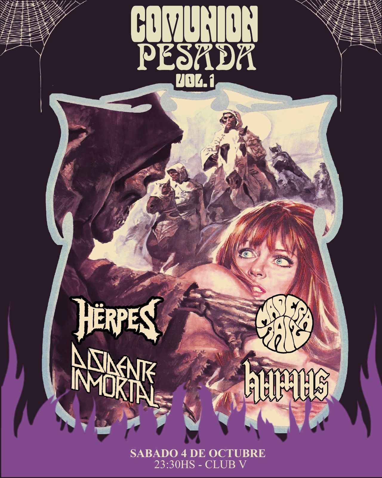 ‘Junta o reunión nocturna de brujos y brujas, con la supuesta intervención del demonio ordinariamente en figura de macho cabrío, para sus prácticas mágicas o supersticiosas’. Así es la primera respuesta que nos devuelve Google al buscar ‘aquelarre’, aunque si se busca un poco mas, se puede decir también, que el término hace referencia a cualquier tipo de encuentro caótico, apasionado o fuera de lo común. Dicho de otra manera, un grupo de personas reunidas con una intensidad casi mágica, como si algo poderoso estuviese a punto de pasar. Algo así aconteció durante la madrugada del domingo 5 de octubre, en Club V, es que Herpes, Madera Raíz, Disidente Inmortal y Humus, congregaron a las huestes metálicas en lo que se denominó Comunión Pesada, Vol. 1.