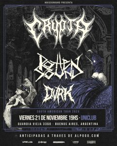 Crypta llega una vez mas a nuestro país, para presentarse en Uniclub el día viernes 21 de noviembre. La última visita de las brasileras fue hace dos años, también en Uniclub y formando parte del Heavy Noise Festival. El condimento especial en esta ocasión, es que vienen acompañadas de dos grandes bandas como Rotten Sound y Dvrk. Desde Finlandia, Rotten Sound llegará para descargar su violento grindcore, mientras que por su parte, los franceses de Dvrk darán muestra de su música extrema y moderna.