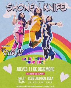 Desde 1981 que Shonen Knife viene dejando una marca en la escena musical tanto en su Japón natal así cómo en el mundo. La banda está formada por Naoko Yamano en guitarra, su hermana Atsuko Yamano en bajo y Risa Kawano en batería, en su música logran mezclar punk rock, pop, hardcore y metal pero con letras alegres y divertidas. Más de 40 años después están lejos de retirarse, prueba de ello fue la reciente visita a nuestro país el pasado 11 de diciembre en CC Bula. Las invitadas a abrir la noche fueron Las Vin Up. La noche prometía punk, baile y vestidos de colores.
