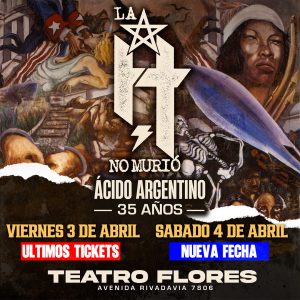 El metal argentino está de festejo, LA H NO MURIO regresa a los escenarios para conmemorar los 35 años de la salida de su disco ÁCIDO ARGENTINO y lo hará con una gira que dará inicio los próximos 3 (últimos tickets) y 4 de abril en el Teatro Flores de Buenos Aires. Entradas a la venta a través de sistema Passline.