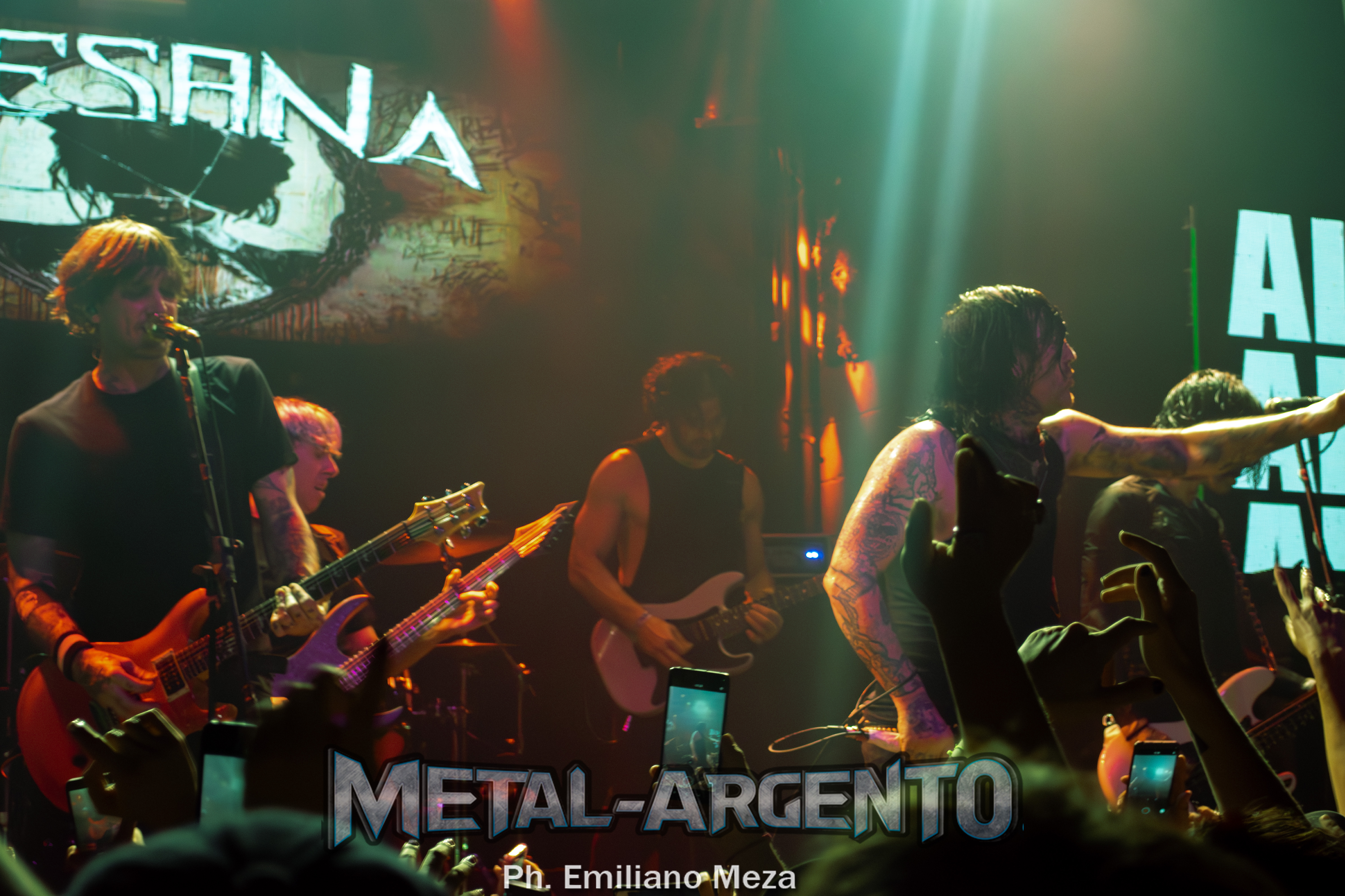 Finalmente para las 21:10 hs aprox fue el momento de que Alesana tomará la posta y uno a uno aparecezcan en escena para. Con un breve saludo comenzarón con “The Curse Of The Virgin Canvas” y para cuando sonó “The Artist” los presentes comenzaron a saltar para demostrarle a la banda que el lugar estaba a su máxima capacidad y generar un momento único, recordando épocas y sensaciones. La lista de temas se basó por supuesto en el disco entero. Fueron poco comunicativos sin dar espacio a charla entre canciones, aunque demostraron en todo momento que estaban felices de estar ahí esbozando sonrisas y miradas con el público. Algo que debemos destacar es que aún tienen esa energía con la que empezaron su carrera, sobre todo en los dos cantantes Shawn Milke y Denis Lee, este último se encargó toda la noche de hacer sus locuras en el escenario además de subir cada tanto a algún fan que se acercaba, siempre sonriendo y abrazando entendiendo que le agradecían sin decirlo por todos.