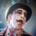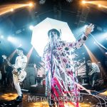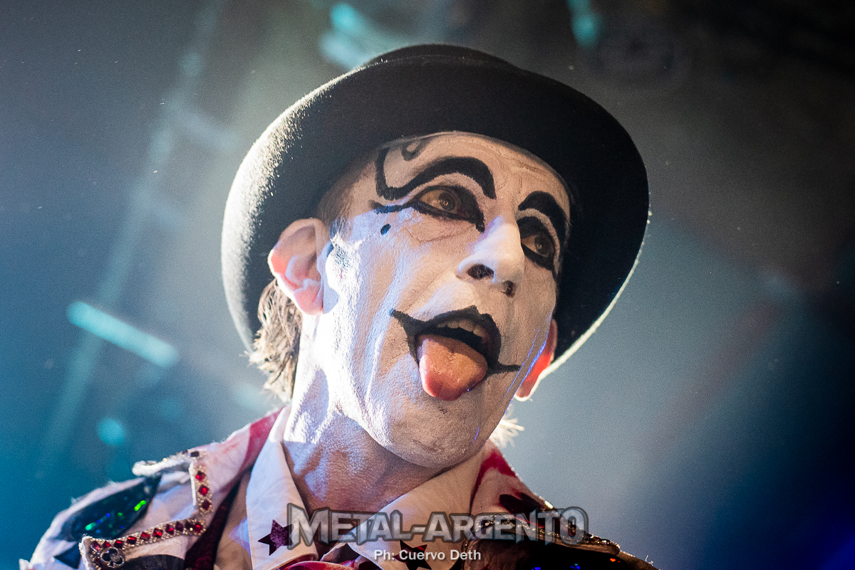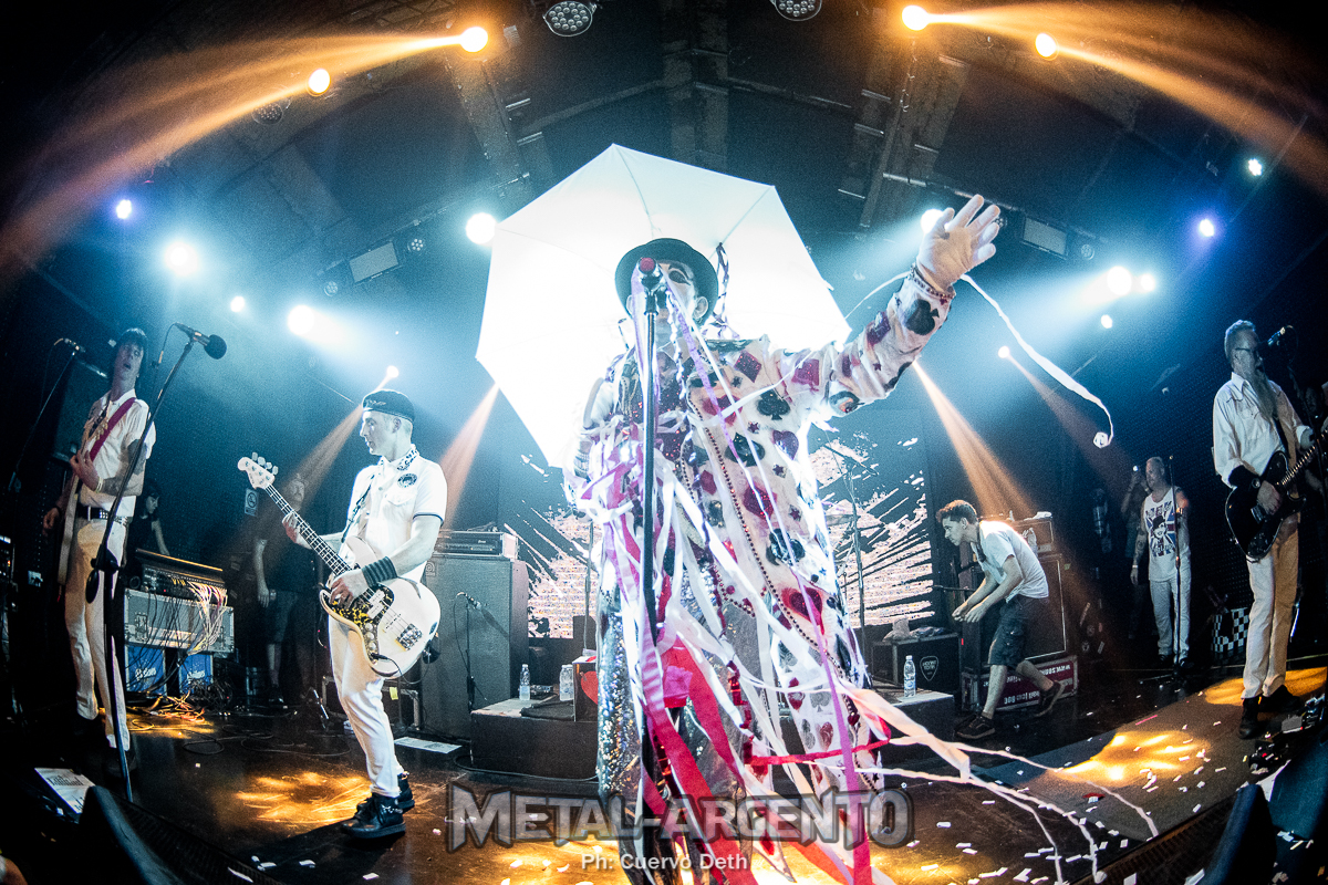 La Naranja Mecánica definió el universo estético que atravesó la identidad de The Adicts, y el inicio del espectáculo pareció rendirle homenaje con la proyección de visuales y recortes de la banda sonora del film. Tras un Hey Ho Let’s Go camuflado, salieron Monkey Warren a escena. En una entrada tan teatral como magnética saludó al público como un maestro de ceremonias, con el rostro maquillado en blanco y negro y una sonrisa que rozaba lo místico. Su capa se abría y se cerraba constantemente, como si desplegara alas rojas y negras con destellos eléctricos. También parecía un guasón con su de naipes de poker, digno de una figura significativa, con glam, brillo y lentejuelas.