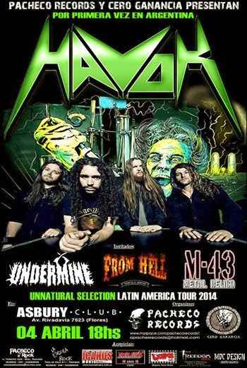 Es una realidad innegable el apogeo de la Nueva Escuela del thrash, heredera de los gloriosos 80’s, y Havok es uno de sus principales exponentes. Con su llegada a nuestro país para tocar el día 4 de abril en Asbury, y si le agregamos también la visita de Violator el año pasado y la Municipal Waste el mes próximo, estamos viviendo en carne propia el crecimiento de bandas que se van superando disco a disco y aún no han llegado a su techo. Cita imperdible para todo thrasher, la jornada arrancó pasadas las 19 horas, aunque para cuando llegué al local ya estaba finalizando la primera banda M-43 que presentaba la última canción de su set, “Maquinarias de involución”. El trío matancero formado por Matias Almiron en voz y guitarra, Emiliano Fontana en bajo y Jonathan Almiron en batería, nos presentó el que denominan “metal bélico”, con grandes influencias de bandas como Sodom. Luego subió al escenario From Hell, grupo de zona norte dedicado exclusivamente a interpretar temas de Pantera, y así pasaron clásicos como “A new level”, “Walk”, “Domination”, “Revolution is my name”, “Cowboys from hell” y “Mouth for war”. Poco antes de las 21 horas comenzó Undermine, formado por Rodrigo Ferreiro “Baka” en bajo y voz, Francisco Cañardo y Matias Capdervila “El mudo” en guitarras y voces y Guillermo Nusfaumer “Willie” en batería. Se destacaron desde un primer momento con un sonido muy potente basado en el thrash más machaquero con influencias death, con los riffs como columna vertebral de sus canciones que alternan voces desgarradoras y guturales profundos. Así fueron alternando con canciones nuevas los temas de su EP Trayendo solamente podredumbre, salido a la luz en 2012, como “La casa de las 100 habitaciones”, “Consumido por la rabia”, “Sufriendo”, y “Bajo el velo de la masacre” con un final entrecortado que me recordó a esas outros de Opeth. Una banda para tener muy en cuenta, que sin dudas deben haberse metido a más de un nuevo espectador en el bolsillo.Ya para las 10 de la noche, la temperatura comenzó a subir en Asbury, como ya es lamentablemente costumbre, mientras la mayoría de los asistentes comenzaron a amontonarse en las cercanías al escenario, y alentar con el clásico cántico del “olé olé”. “Covering Fire” de su disco Time is up (2011) fue la canción elegida para dar pie a una hora a pura intensidad thrasher, seguida de “Point of no return”, de su EP de 2012. Con un sonido bastante claro, y al frente la voz aguda y rasposa de David Sanchez, único miembro restante de la formación original, fue el momento de presentar su último álbum Unnatural Selection con “Give me liberty or give me death” con un llamado a apagar la tv y pensar por sí mismo, y “I am the state” dedicado a aquellos embriagados de poder. El guitarrista Reece Scruggs brillaba con sus solos de guitarra, clave en el sonido de la banda, completada con el baterista Pete Webber y el recientemente incorporado Michael Leon a cargo de las cuatro cuerdas. “From the cradle to the grave” fue la otra canción del EP Point of no return que desplegó su arsenal de violencia por todo el lugar, con grandes circle pits como contrapartida bajo el escenario.