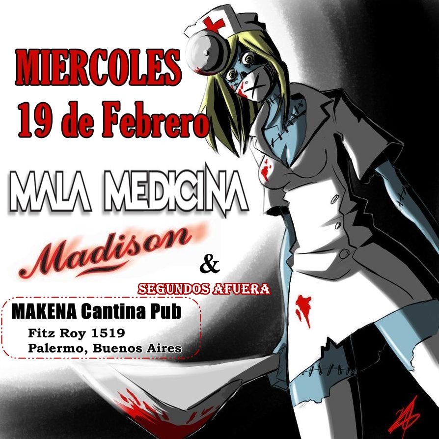 Miércoles por la noche, mitad de semana, la ciudad trabaja sin cesar con algunas personas yendo a descansar, pero eso no detiene al rock and roll. En esta oportunidad se presentaba Madison y Mala Medicina en Makena cantina pub, situado en el barrio de Palermo. La noche se inicia con Madison con la potente voz femenina rock and rollera de Martina con “Imposible” para darle un ritmo movido a la noche, siguiendo con “Queremos más”, perteneciente a su segundo disco, con unos excelentes riff por parte de Mariano. La voz de Martina se iba tornando más grave para continuar la noche con “Fugitivo” acompañado del bajo de Chotas, desafortunadamente casi terminando el tema Mariano sufre un pequeño accidente donde se le desconecta la guitarra pero no por eso pierde potencia la canción. Después de resolver el pequeño desperfecto era el momento ideal para un cover y nada mejor que “She Wolf” de Megadeth para darle un toque de metal a la noche. Continuando con “Crisis” acompañados de coros del bajista, “Tiempos de cambio” y el cover de Billy Idol “Rebel yell” dando esos tintes de glamour y hard rock ochentoso que con la voz de Martina generaba un clima perfecto. Entre tema y covers pasan a “Whisky”, “Wasted Years” de Iron Maiden pasando a una perfecta distorsión de viola con “Hellraiser” de Ozzy Osbourne. Culminando con dos temas más propios de la banda con una gran interacción con el público, subiendo la temperatura de a poco acompañado de la intensidad de la batería de Rosco.