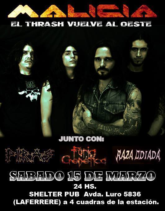 Después del show de Malón en el Auditorio Oeste, encaré camino hacia el Shelter de Laferrere, en donde Malicia estaría haciendo su primera presentación del año en zona oeste. La primera banda fue Piras que no alcancé a ver por cuestiones de horario. Ya pasadas la 1, comenzó el show de Raza Odiada, quienes salieron a escena con “De Pie” de su último disco Querer es poder (2012). Los originarios de González Catán ejecutan un heavy metal muy poderoso que se destaca por la aguerrida voz con enérgicos agudos de Maximiliano Torres y los machaques y virtuosos solos de guitarra de Antonio López. El quinteto lo completa Abel Ledesma en bajo, Emanuel Mansilla en guitarra y Omar Gadea en batería. A continuación “Noches de metal” y “Niños ¿el futuro?” de su disco previo Igual que ayer (2005) calentaron el ambiente. Luego de “Ansiedad”, siguieron con las canciones de su última placa dando lugar a uno de los momentos más interesantes del show con “Sariri” con un toque folklórico que aportó Antonio López con el cicus. “Pasado cruel” de Igual que ayer y “Fuego y acero”, el tema apertura de su último cd, fueron los temas con que el set llegó a su fin tras aproximadamente cuarenta minutos.