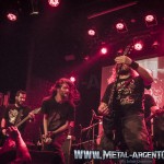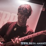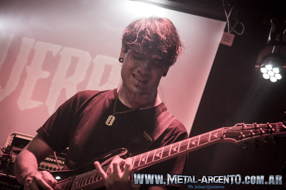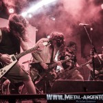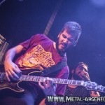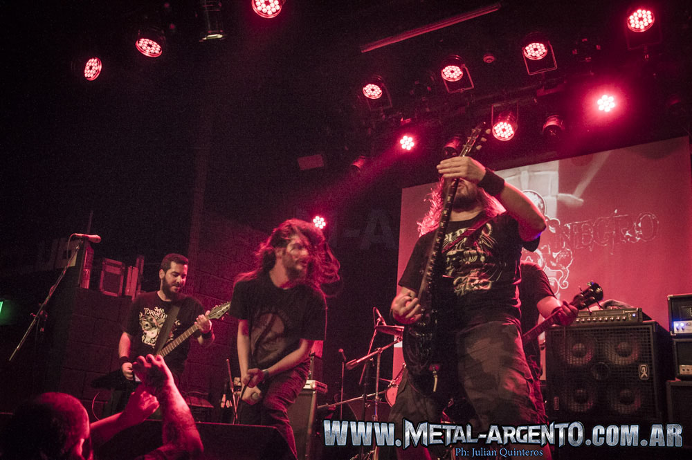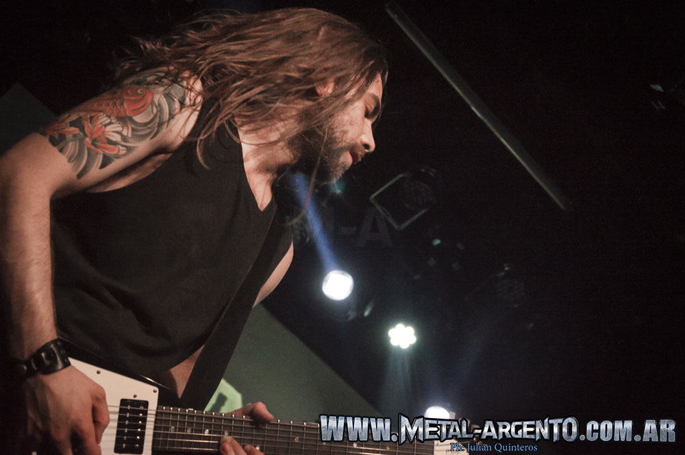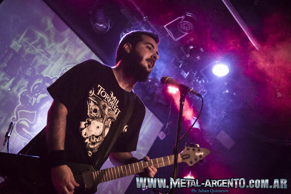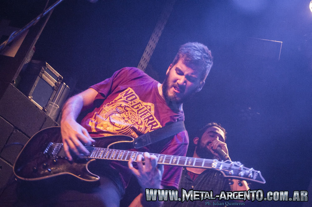 Acto seguido fue el turno de Sobre Tus Cenizas. La banda tiene un problema y una bendición. Es complicada de clasificar en las ramas del grandilocuente árbol metalero. Si bien la voz de Juan Ignacio Orcajada recorre diferentes facetas, los podridos no llegan a serlos del todo. En sus pasajes a limpio tampoco es netamente limpio. El cantante mantiene una línea cruda que se destaca. Una voz del under que merece seguir de cerca. Las distorsiones de Alexis Prutt y Pablo Roman son violaciones auditivas que por momentos remiten al djent pero que nunca dejan la adrenalina de lado. Ezequiel Courvoisier da la cuota extrema con sus extremidades al encarar una batería aplanadora. Por último, Douglous, mas ala de haber sido su último concierto en STC, da simplemente cátedra con sus lineas de bajo. Todo esto se vio reflejado en los cantos, alientos, bailes, saltos que acompañaron los ritmos de «Puertas de Percepción» y «El carroñero».