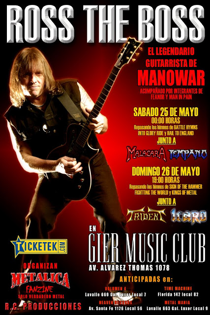 El 25 y 26 de Mayo pasó el legendario guitarrista de MANOWAR, Ross The Boss, y venía con un cargamento de himnos de la banda antes citada a cuestas, junto a las bandas nacionales Ícaro y Trident. La cosa era así, el sábado 25 interpretaba temas de Battle Hymns, Into Glory Ride y Hail to England, el domingo 26 temas de Sign of the Hammer, Fighting the World y Kings of Metal. Todo esto en el local de Colegiales, Gier, organizado con mucho esfuerzo por la gente de Fanzine Metalica. Yo estuve en el show del domingo, llegué para ver los últimos cuatro temas de Trident, banda oriunda de la ciudad de Rosario que cuenta con cuatro discos en su haber y muchos años en la escena. Ejecutan un heavy metal clásico, con riff’s bien ochentosos, teclados muy presentes y las voces muy bien laburadas, a cargo de su cantante, y en algún que otro tema por su tecladista. Me quedé con ganas de ver algunos temas más, muy recomendables.