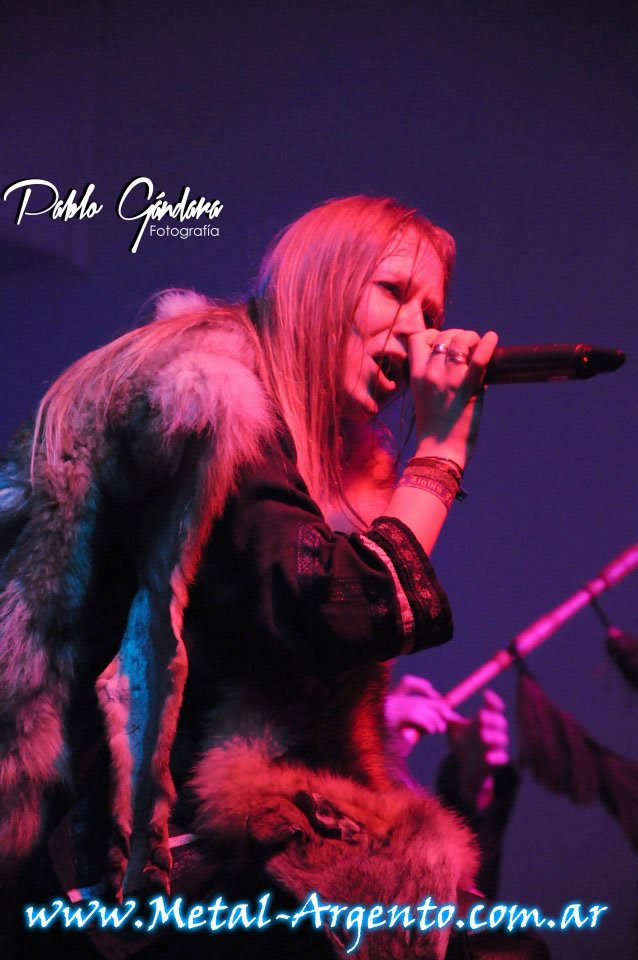 Tengo que hacer un párrafo aparte para Masha, la vocalista de Arkona, que a pesar de estar medio enferma (tenía problemas de garganta), se dejó la vida en el escenario. Es increíble el contraste entre la Masha reservada, y hasta casi diría tímida que vi en las entrevistas, y la Masha arriba del escenario. No para un segundo, headbangea, agita, hace invocaciones chamanicas, etc. Y pasa con una facilidad desconcertante de la voz melódica a los guturales.