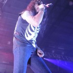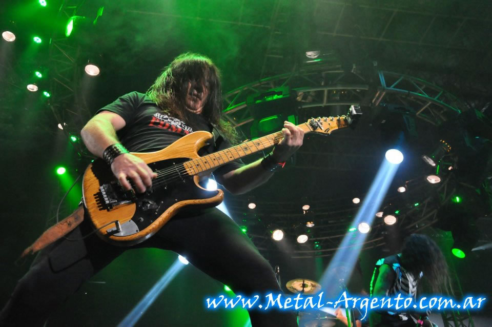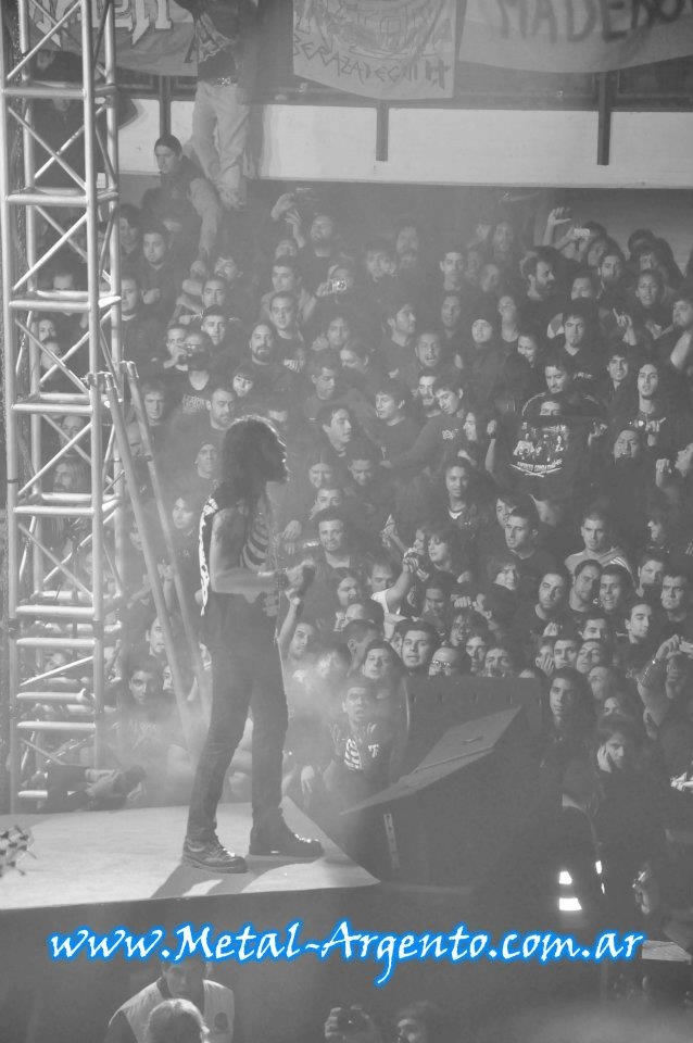 Todo seguía parejo y en su lugar. Músicos de acá para allá, buen sonido, gente cantando a morir y entregando todo como debe ser. “Síntoma de la infección”, tema que abrió la fecha del 18 de Diciembre de 2011, era el cuarto de una larga lista. Casi a la mitad de la canción, un fanático se subió al escenario y dio un par de vueltas hasta que fue y lo abrazo a Claudio que no tuvo reacción alguna. Estuvo unos 20 segundos ya que no aparecía nadie para sacarlo hasta que subió creo que un asistente a sacarlo y atrás se subió uno de prevención y juntos se lo llevaron por la pasarela donde había entrado la banda. “Nido de almas” terminaba con la seguidilla inicial para que ahora Claudio salude a toda la gente y diga algunas palabras. Luego del saludo y una bocanada de aire para todos continuaba “Grito de Pilagá” donde, si no me equivoco, otra vez el mismo fan se subió pero esta vez lo fue a buscar a Karlos. En esta ocasión no fue tan afortunado ya que enseguida lo sacaron a los empujones.