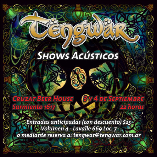 Noche Tolkidiana, ambiente familiar y de amigos, ricas cervezas y buena música. Eso es lo que se vivió en Cruzat Beer House, donde se presento Tengwar realizando dos shows acústicos el viernes 3 y sábado 4 de septiembre.