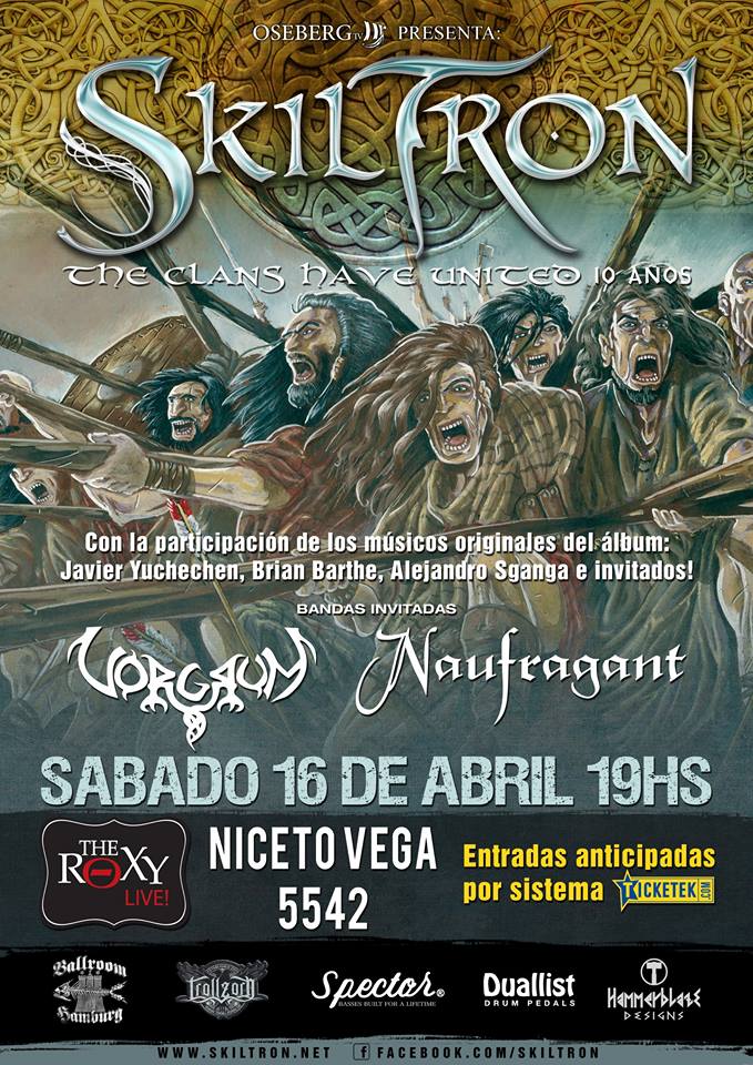 Luego de varios años de ausencia, finalmente Skiltron hizo su regreso a los escenarios porteños. Sin dudas la banda más trascendente y representativa del folk/celtic metal de nuestro país, en los últimos años se abocaron principalmente a presentarse en el viejo continente. Se destacaron principalmente por su aparición en mítico Wacken Open Air, siendo la primera banda argentina en hacerlo. El décimo aniversario de la edición de su primer disco The Clans have united fue la excusa perfecta para anunciar un show muy esperado en el Roxy Live de Palermo.