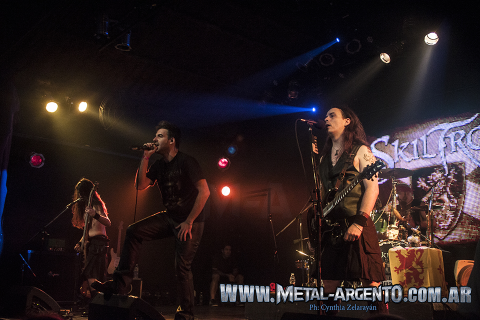 Muy puntualmente a las 21hs Skiltron se hizo presente, contando con los músicos que grabaron aquel disco. Se destacó el cantante Javier Yuchechen, que además de una excelente voz demostró carisma y buen manejo del público. La presencia de gaitas a cargo de Brian Barthe y violines en manos de Alejandro Sganga aporta el principal elemento folk y enriquece enormemente la propuesta, dotándola de un color poco visto por estas latitudes. Con Emilio Souto como único guitarrista, en ocasiones el sonido quedaba algo flaco, pero en líneas generales la performance fue muy buena y el sonido final muy claro y potente. Matías Pena e Ignacio López en batería y bajo fueron claves en este aspecto. El álbum celebrado, The clans have united, entonces fue ejecutado en su totalidad y en orden, con cada tema enormemente festejado tras tantos años sin escucharlos en vivo. Incluso algunos como “Rising soul” o “Across the centuries” no se tocaban desde la época en que dicho material fue editado.