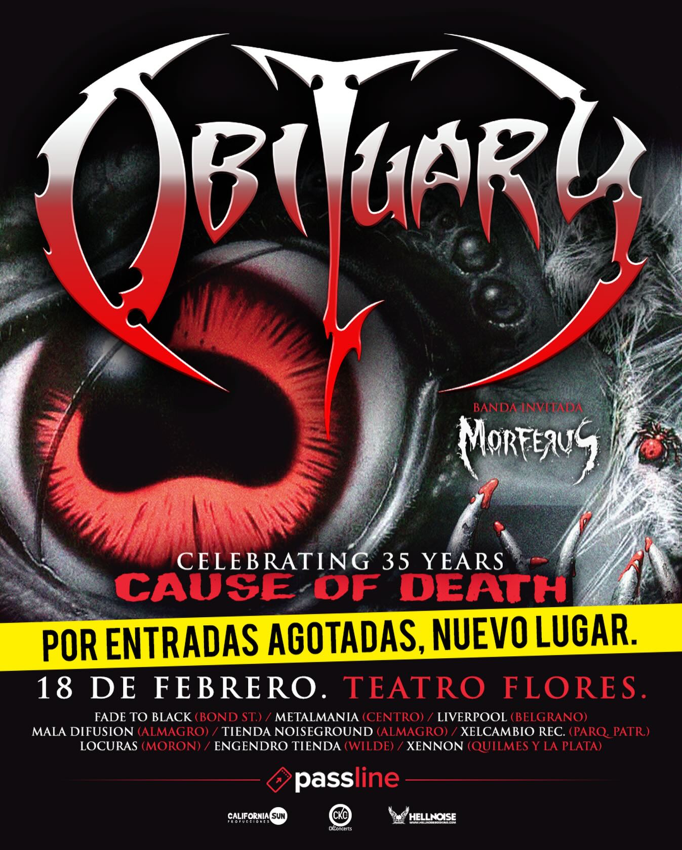 Debido a la alta demanda de entradas, el show de Obituary en Argentina se trasladó de El Teatrito a una nueva locación: El Teatro Flores (Av. Rivadavia 7806, C.A.B.A.). La legendaria banda estadounidense de death metal se presentará en el marco de la celebración de los 35 años de su icónico álbum Cause of Death, considerado uno de los discos fundamentales del metal extremo mundial. Obituary ofrecerá un show único donde repasará su carrera, centrándose en reinterpretar uno de los trabajos más influyentes del death metal y todos sus clásicos. La cita será el miércoles 18 de febrero.