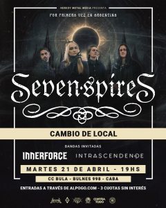 El martes 21 de abril a partir de las 19 hs, la banda estadounidense Seven Spires se presentará por primera vez en Argentina. El encuentro será en Club Cultural Bula. ubicado en la esquina de Bulnes y Lavalle, CABA.